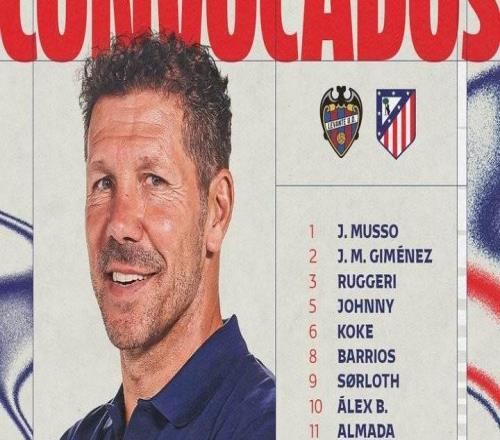 马竞战莱万特名单:格子、小西蒙尼缺阵,一队外场球员剩16人