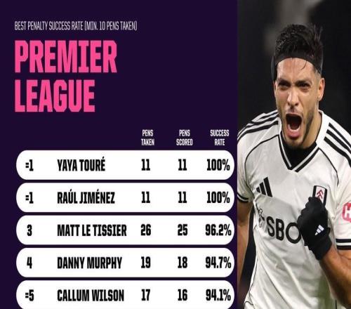 • 英超历史点球命中排行:劳尔希门尼斯和亚亚图雷均11罚全中