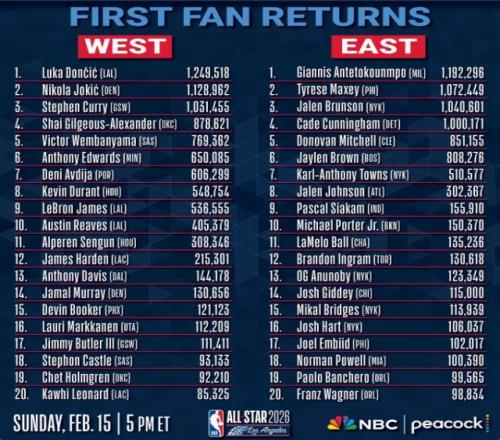 • 全明星首轮投票!东契奇联盟票王!詹姆斯仅排西部第九