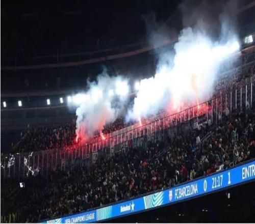 法兰克福球迷在诺坎普球场:燃放焰火、投掷玻璃杯、敲打安保屏障