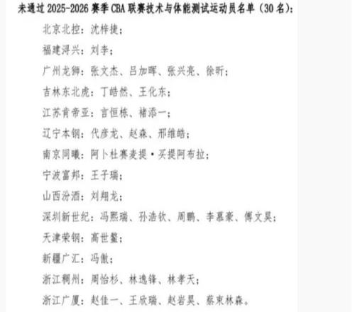CBA体测更新:30人未合格,6队全员通过,辽粤2将下赛季免测