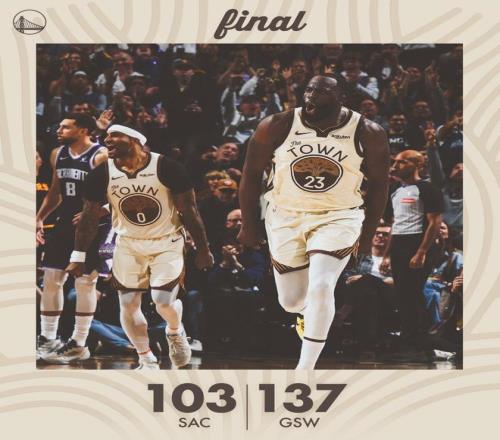 德罗赞高位跳投得分,波杰姆斯基暴扣,随后3罚全中,勇士轰出了23比8的攻势,取得28分领先。施罗德2罚全中,理查德回敬远投,威少、穆迪各有上篮得分。威少连续失误,希尔德、波斯特相继远投得分,距离终场不足2分30秒,勇士领先35分锁定胜局。两队开始在场上练兵,时间逐渐走完。最终,勇士以137比103完胜国王。萨克拉门托单节19比40落后。