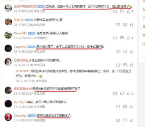 球迷评论很有意思,描述了他俩此刻的心境,球迷说“哥俩说,这是一场计划内的输球,还TM迷惑对手呢,自己都迷糊了”、“俩人高兴死了,来了以后第四节没上过,钱挣的真轻松”、“哥俩说教练都不在乎输赢咱俩更不愁了”。队员都不关心场上情况,不在乎输赢,落后10分还能笑得出来,这样的北京队还有救吗?还能发誓夺冠吗?看来真的有一点难了。你们说呢?